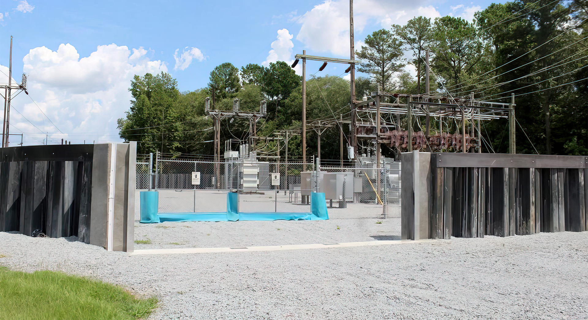 A major utility provider in North Carolina investigated flood protection solutions for the foreseeable future and examined long term solutions to shield against flood waters and block seepage. Steel sheet piling was initially examined, but price volatility, corrosion, installation costs, and safety concerns were burdensome. The utility turned to CMI for a permanent solution to protect against flood waters during the rebuilding process. CMI was able to provide quick installation schedules with materials capable of withstanding harsh weather conditions and guidelines provided by USACE’s (United States Army Corps of Engineers) Design Guide for I-walls on Flood Walls.